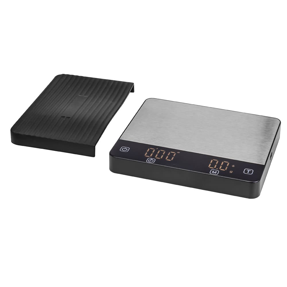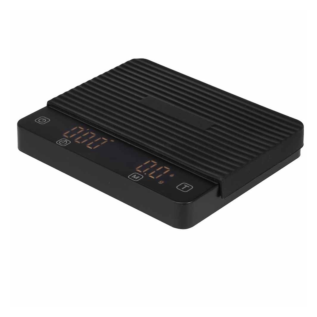 Simple and practical coffee scale with timer and all functions you need to brew espresso. Including automatic timer start. Comes with silicone mat to weight accurately even with hot coffee on the weighting plate.